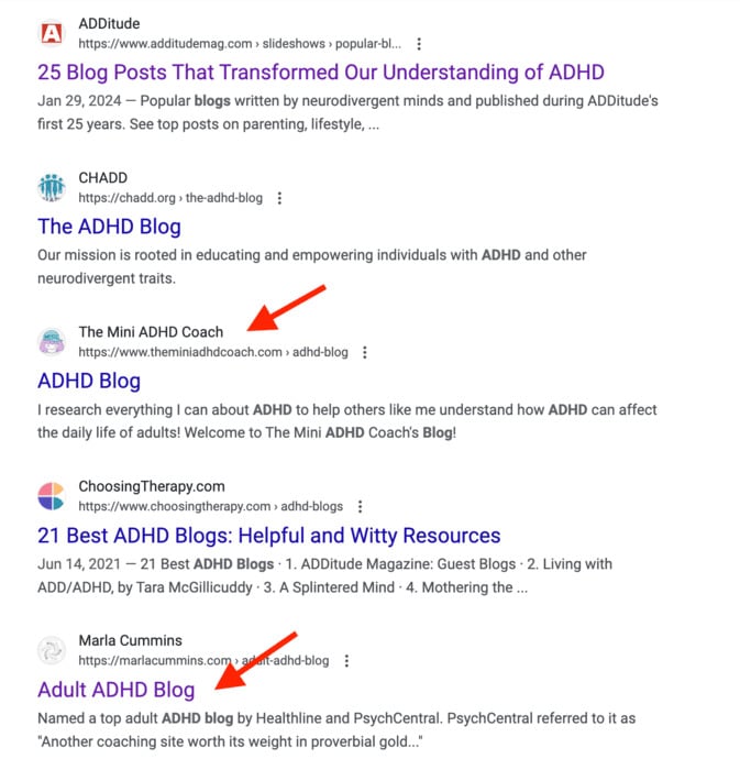 Let’s take a look at the search engine results page (SERP) for the query “ADHD blog”: